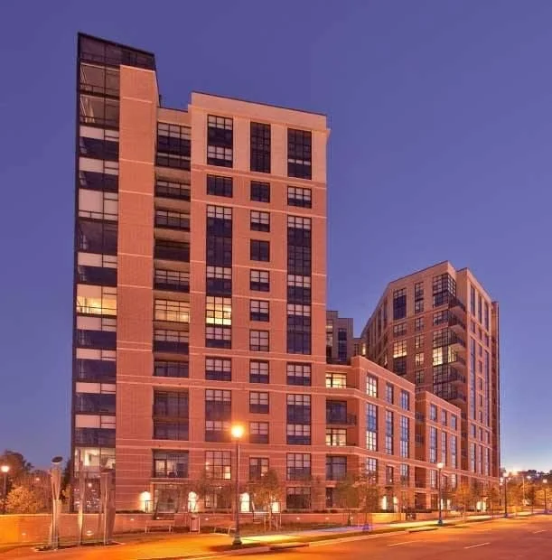 This residential condominium anchors the northern entry for the Village at Shirlington and is part of the second phase for the village in which significant residential density replaces the surface parking surrounding the original commercial main street core. The project was purchased after original 1981 site plan approval was amended from hotel to residential condominium by a previous owner in 2003. Design team developed unit plans, interiors and modified the exterior and public area design through the site plan amendment process. The design reflects the extensive community involvement during the public approval process. Duplex 2 story units form a 4-5 story townhouse scale base as a ‘liner’ to screen the above-grade garage at the street. Unit entrances front the sidewalk to give life and pedestrian scale to the streetscape – rather than only a single building entrance. The materials used are minimal and industrial. The scale of the building is modulated with the exterior composed of a series of narrow bays (towers) in brick with precast belt courses, aluminum and clear glass. Brick color was chosen to reflect the residential use, to integrate with the other new residential buildings which contrast with the buff precast of the commercial core. The interiors include open plan living areas, exposed concrete ceilings and floor to ceiling glass. Common areas are finished with industrial materials and lighting, with brick, steel and wood walls and ceiling in the main lobby. A green roof and roof top garden terrace have been incorporated at level five, as well as public art at the northern entrance to Shirlington. The unit mix includes a wide range of types, as well as 2-story duplex and loft units with mezzanines.